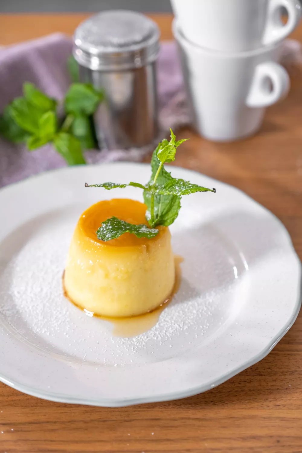 Een romige huisgemaakte flan met roomkaas en honing, overgoten met een krokante karamelkorst en ideaal als feestelijk of zomers dessert. Eieren, roomkaas, honing, volle melk en maïszetmeel worden tot een zijdezachte vulling gemengd en rustig gegaard in een waterbad in de oven. Laat volledig afkoelen, keer om en werk af met een takje munt voor een elegante, klassieke toets.