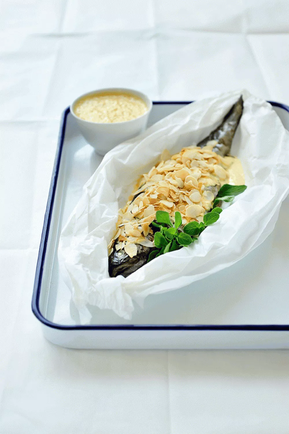 Haal de vis uit de oven, leg op een bord en plooi het pakketje open. Overgiet met een flinke lepel saus en strooi er de amandelschilfers over.