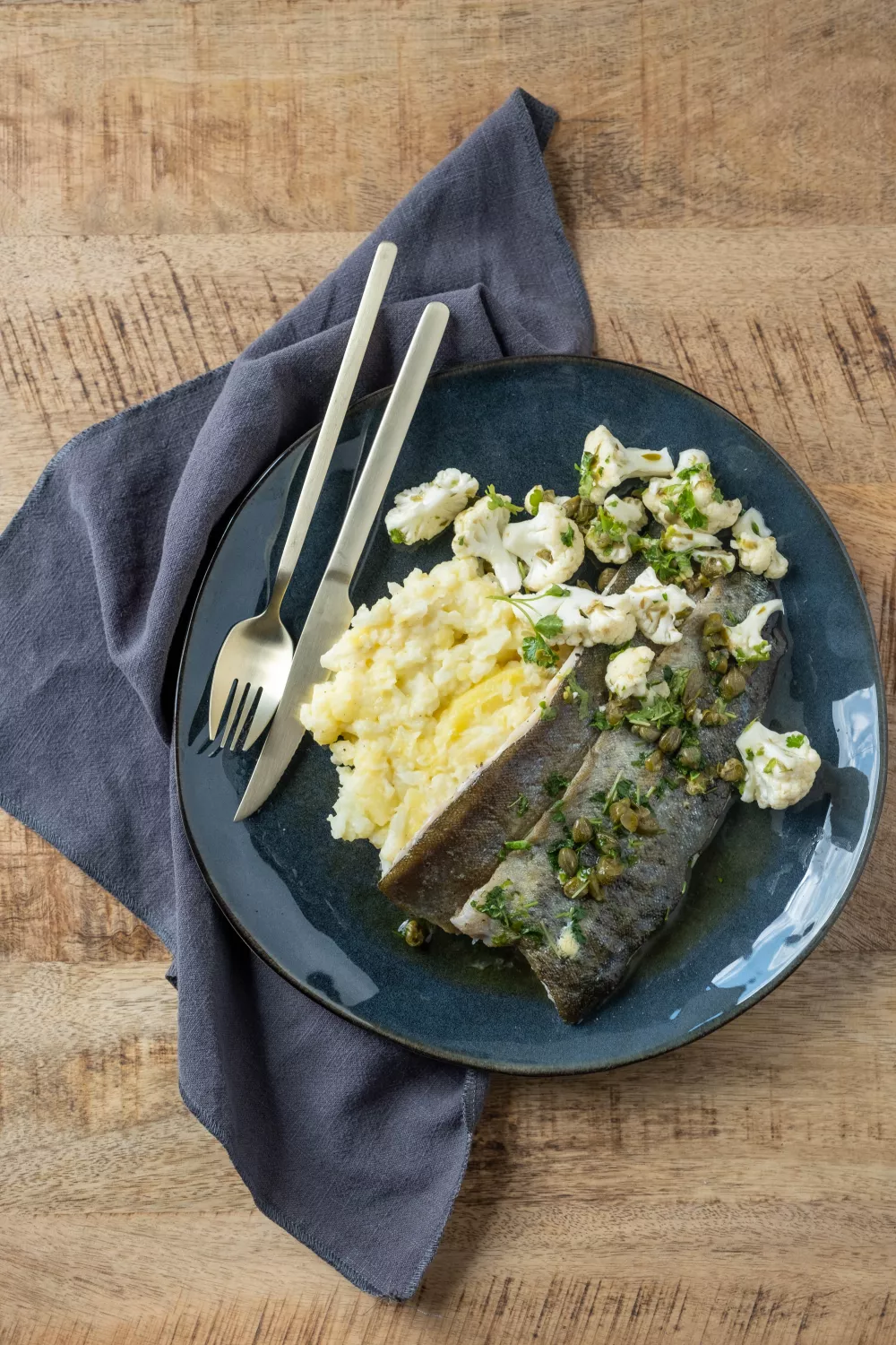 Zachte bloemkoolstoemp met romige aardappel en een fris kappertjesslaatje vormt het perfecte bord bij goudbruin gebakken forelfilet. Dit eenvoudige visgerecht combineert koken en stampen met een snelle bakmethode voor de forel, ideaal voor een doordeweekse maaltijd of een licht weekenddiner in de lente en zomer. Citroen en peterselie geven een frisse toets die de nootachtige bloemkool mooi in balans brengt.