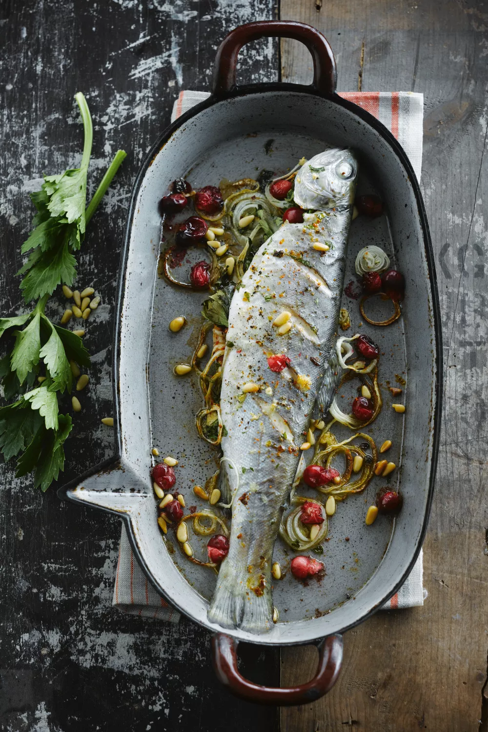 Ovengebakken forel gevuld met uien, knoflook, fijngehakte selder en frisse veenbessen, afgewerkt met knapperige pijnboompitten en een hint cayennepeper. Dit eenvoudige visgerecht combineert zachte, aromatische smaken met een lichtzure toets en is perfect voor een doordeweeks diner of een feestelijke herfstavond in herfst en winter. Gebruik olijfolie en verse forel voor een sappig resultaat.