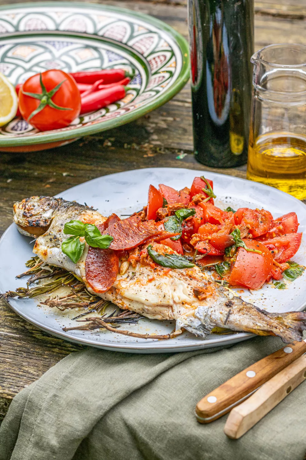 Forel omwikkeld met rozemarijn en citroen en een pittige tomatensalsa met chorizo