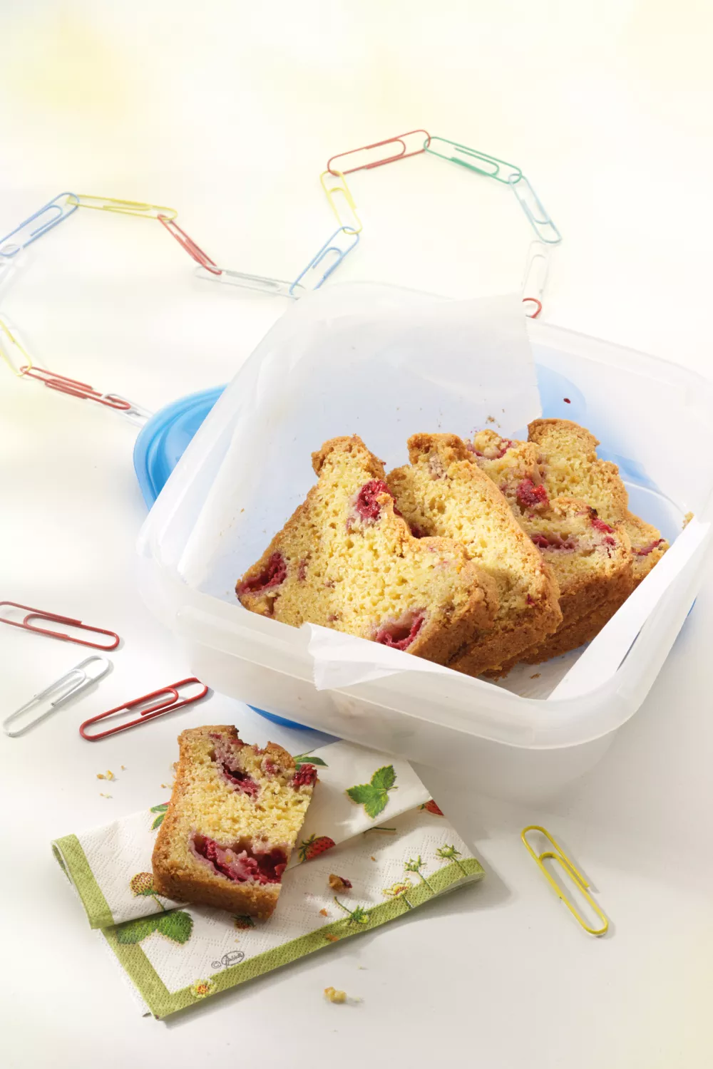 Verwarm de oven tot 180 °C. Zeef de bloem en het bakpoeder in een grote kom. Meng de rest van de ingrediënten voorzichtig in een andere kom, zorg dat de frambozen heel blijven. Spatel dit door de bloem.