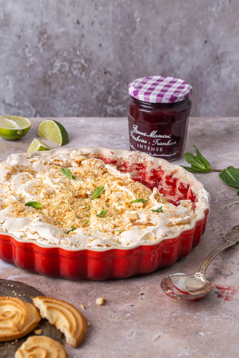 Deze zomerse frambozentaart combineert sappige frambozen en Bonne Maman frambozenconfituur met frisse limoen voor een fruitig en lichtzoet dessert dat perfect is voor picknick of feest. Een krokante bodem van koekkruimels en een luchtige, goudbruine meringue van opklopte eiwitten zorgen voor een knapperige tegenhanger en elegante structuur. Met een korte voorbak en een langzame nabehandeling op lage temperatuur zet je in een handomdraai een verfijnd maar eenvoudig taartje op tafel.