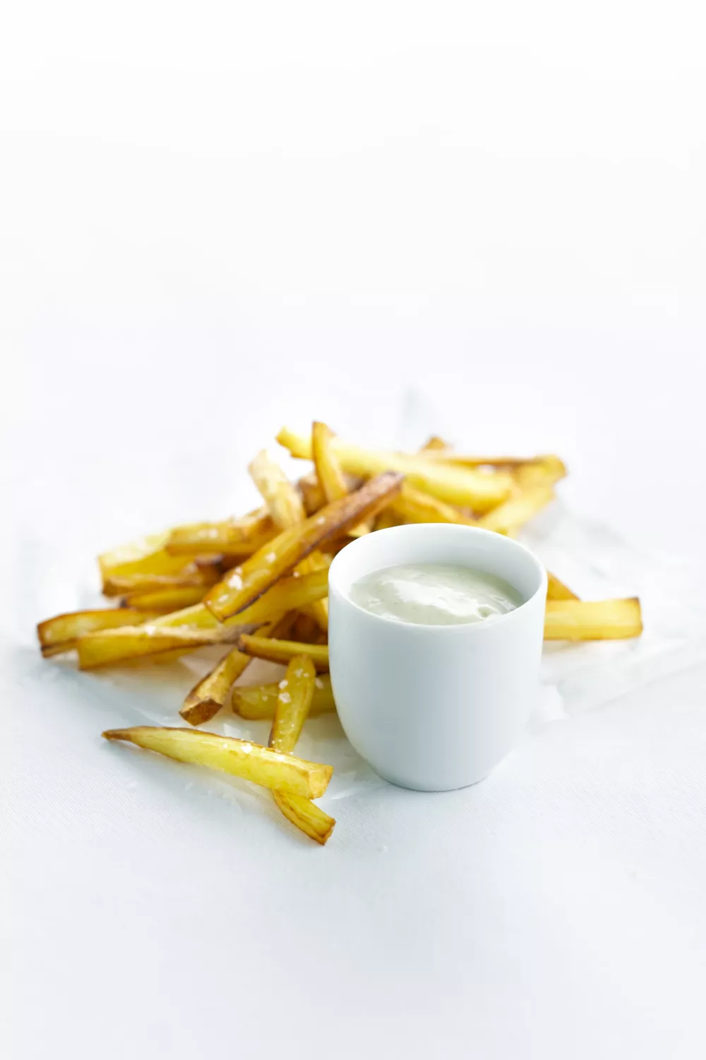 Bestrooi de frietjes met zeezout en serveer met de kruidenmayonaise.