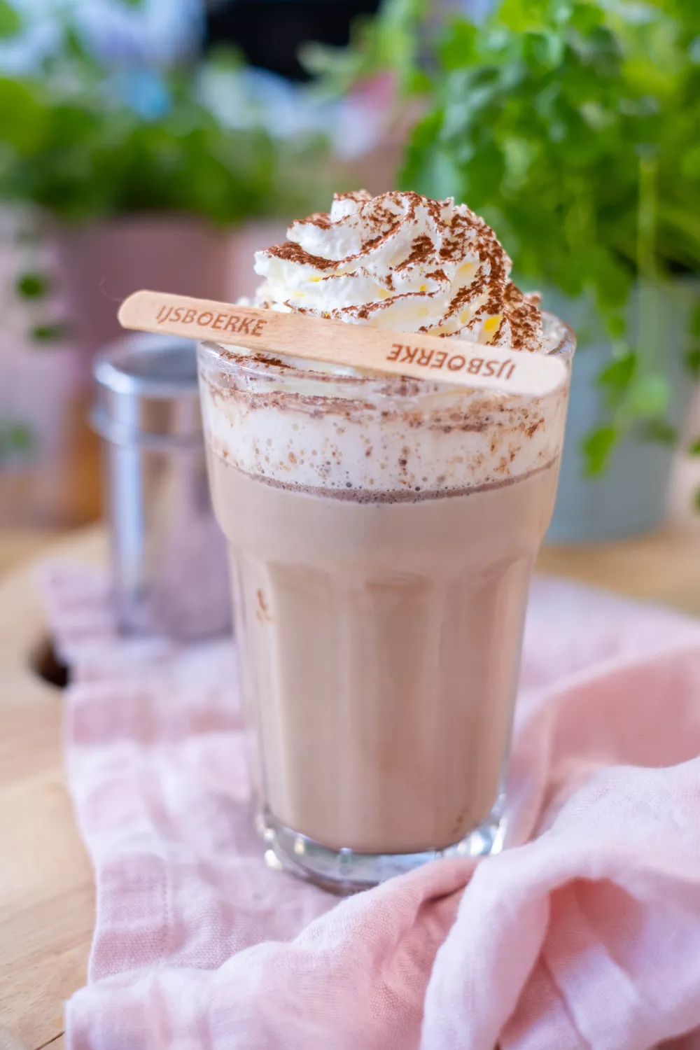 Roer goed met het stokje van de frisco en werk de koffie nog af met een toef slagroom en een laagje cacaopoeder.