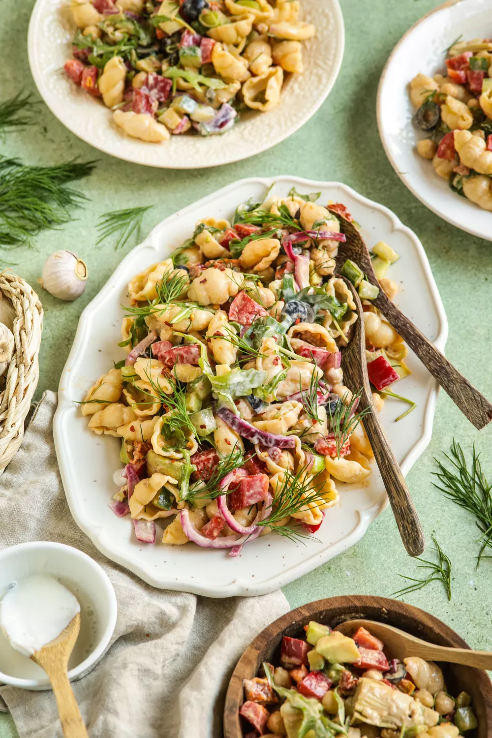 Frisse pastasalade met romige tahindressing, zongedroogde tomaten, dille en artisjok brengt mediterrane smaken op je bord. Met pasta, kikkererwten, avocado en knapperige groenten is het een voedzame plantaardige maaltijd, ideaal voor lunch, zomerpicknick of als bijgerecht bij de barbecue. Kook de pasta, hak alles fijn en meng met tahin en sojayoghurtdressing voor een lichte maar vullende smaakexplosie.