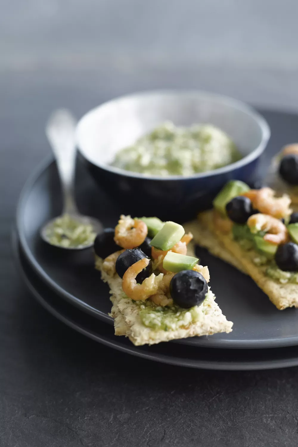Knapperige crackers belegd met romige avocado, zoute grijze garnalen en frisse bosbessen zorgen voor een verrassende smaakmix. Een zelfgemaakte cashewnotenpesto uit de blender voegt romigheid en nootachtige bite toe, afgerond met limoensap, koriander en een snufje Parmezaanse kaas. Perfect als zomerse borrelhap, licht voorgerecht of snelle party snack.
