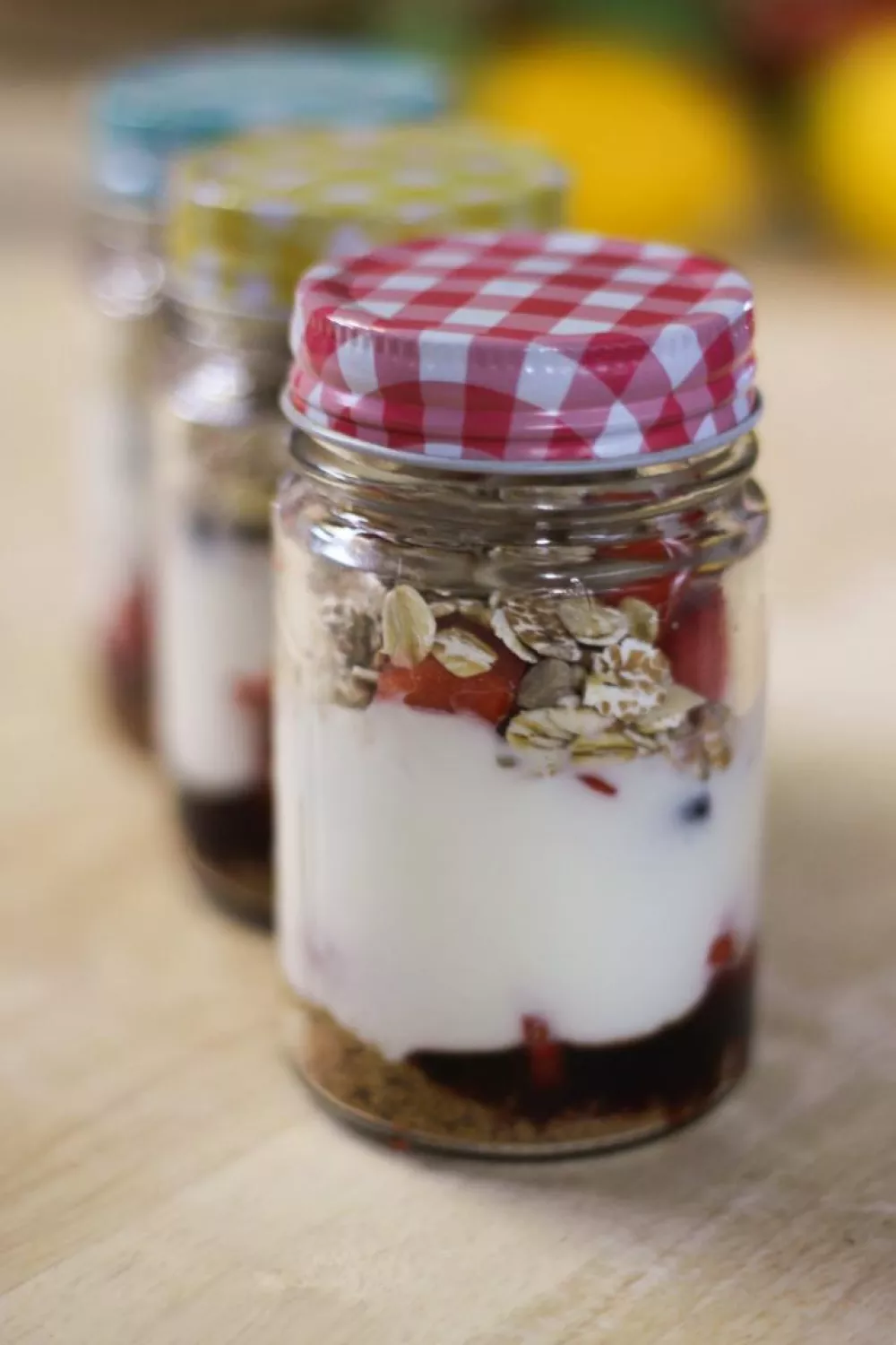 Vul nu verschillende potjes met de ingrediënten. Begin onderaan met een laagje speculooskruimels, lepel daar de bramencoulis over, schep er wat aardbeitjes en besjes op en lepel er een laagje yoghurt over. Vul de potjes verder op met een laagje muesli.