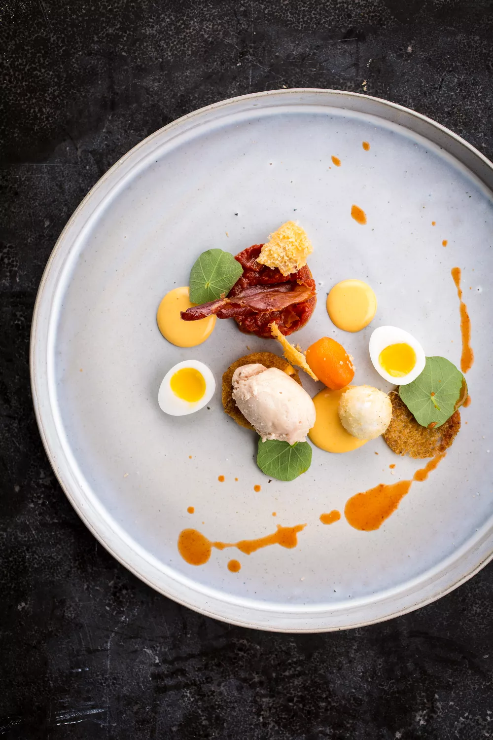 Pocheer de kwarteleitjes. Breng water aan de kook. Leg de koude eitjes in het water en blancheer ze 1 minuut en 40 seconden. Haal de eitjes uit het water en laat ze schrikken in ijswater. Leg de eitjes opnieuw in het water en blancheer ze nu 2 minuten. Haal de eitjes uit het water en laat ze schrikken in ijswater. Pel voorzichtig twee eitjes en snijd ze doormidden. Pel en haal de andere eitjes voorzichtig door paneermeel. Verhit een frituurpan en frituur de gepaneerde eitjes kort.