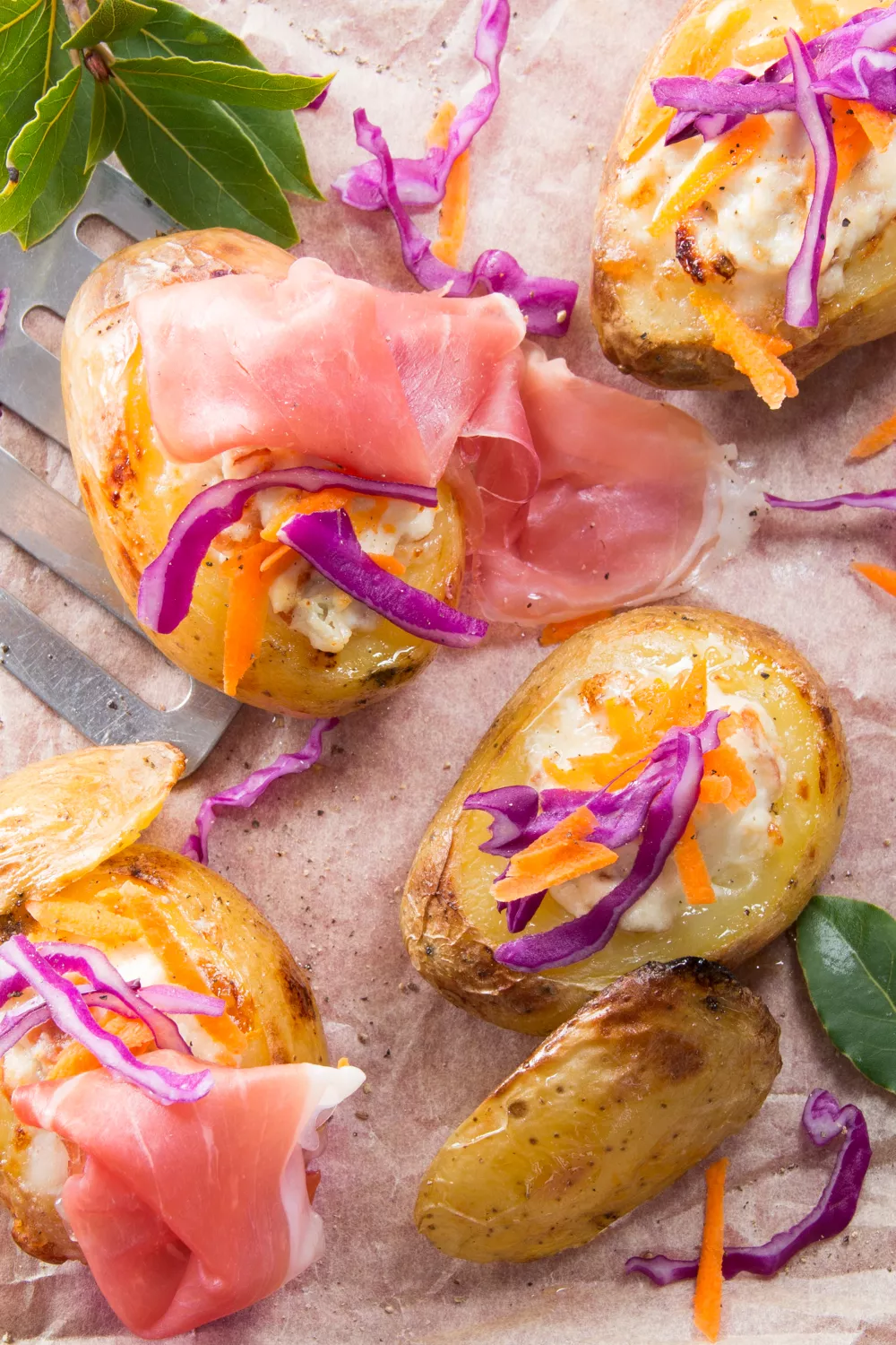 Deze ovengebakken gevulde aardappelen combineren romige ricotta en pittige gorgonzola met krokant gebakken Parmaham, een hartig comfortgerecht dat perfect past bij een gezellig herfst- of winterdiner. De aardappels worden uitgehold, gevuld met boter en het kaasmengsel en kort teruggebakken tot alles smelt, en krijgen frisse textuur van fijngesneden venkel, wortel en rode kool.