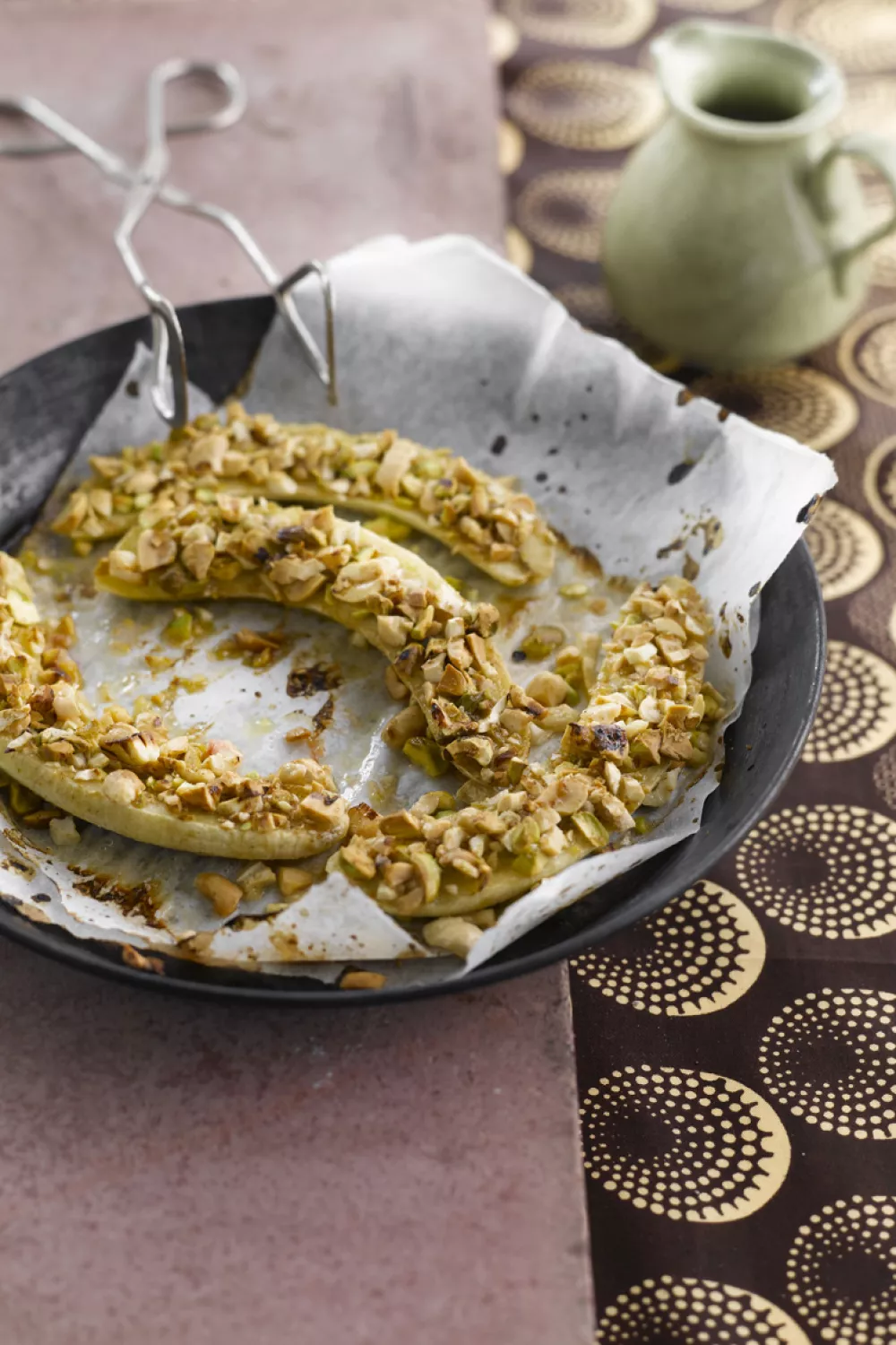 Snijd de bananen in twee en leg op een ingevette bakschaal. Meng de cashewnoten met de pinda’s, pistachenoten, gedroogde kokos, suiker, nootmuskaat en kaneel.