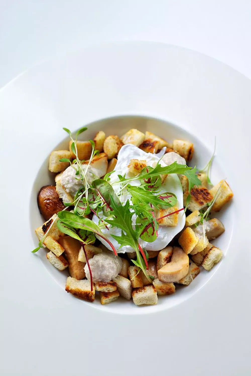 Een elegante herfstige lunch of luxe brunch met gebakken eekhoorntjesbrood, knapperige croutons en een romig gepocheerd eitje. Hartige paddenstoelen worden kort aangebakken in geklaarde boter en verwerkt tot een geurige eekhoorntjesbroodmayonaise, terwijl broodblokjes goudbruin bakken voor extra textuur. Ideaal voor een bourgondische maaltijd of verfijnde start van de dag, met umami en frisse jonge sla als tegenhanger.