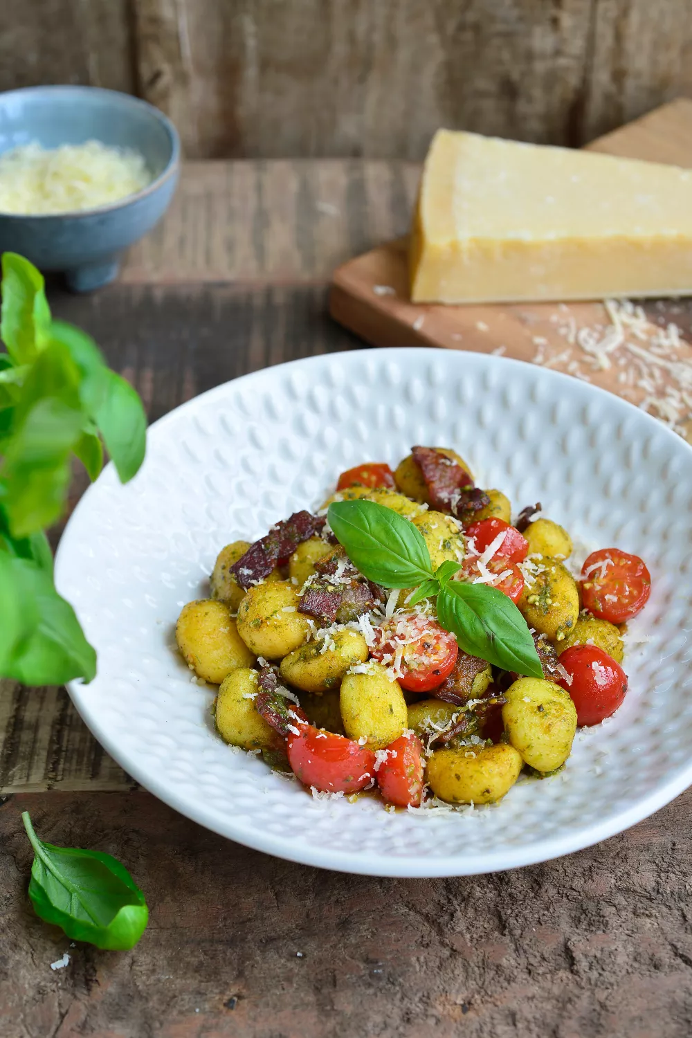 Bak de spekreepjes krokant in een grote pan, voeg de gnocchi, kerstomaatjes en de pesto toe. Meng goed en laat enkele minuutjes bakken totdat de gnocchi mooi goudbruin zijn en de tomaatjes lauwwarm.