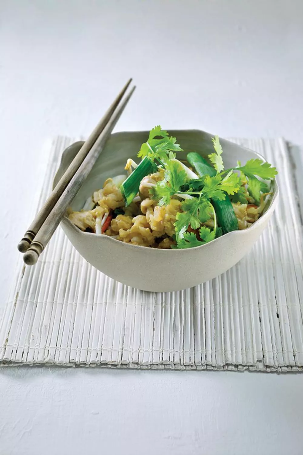 Een geurige gebakken rijst met malse kip, losgeklopte eieren, knapperige wortel en een frisse finish van koriander en lente-ui. In een hete wok roerbak je rijst met knoflook, vissaus en sojasaus tot alles licht gekaramelliseerd en smaakvol is, met sojascheuten voor een frisse bite. Perfect als snel doordeweeks diner of lichte lunch in het voorjaar en de zomer.
