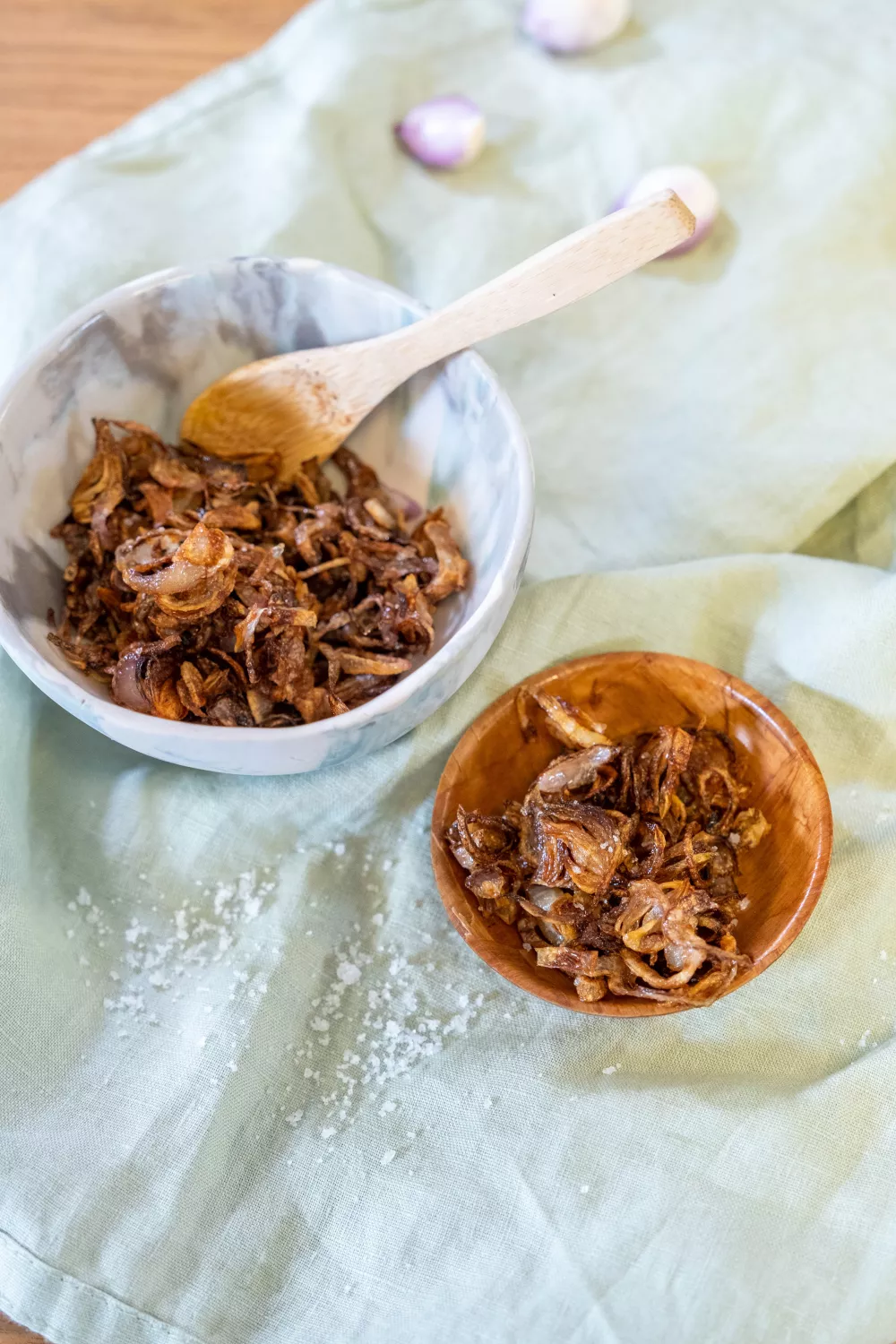Verhit een ruime hoeveelheid olie in een wokpan op het vuur. Voeg de sjalotjes toe in kleine porties en frituur ze tot ze lichtbruin zijn. Laat de gebakken uitjes uitlekken op keukenpapier en bestrooi ze met een snuifje zout.