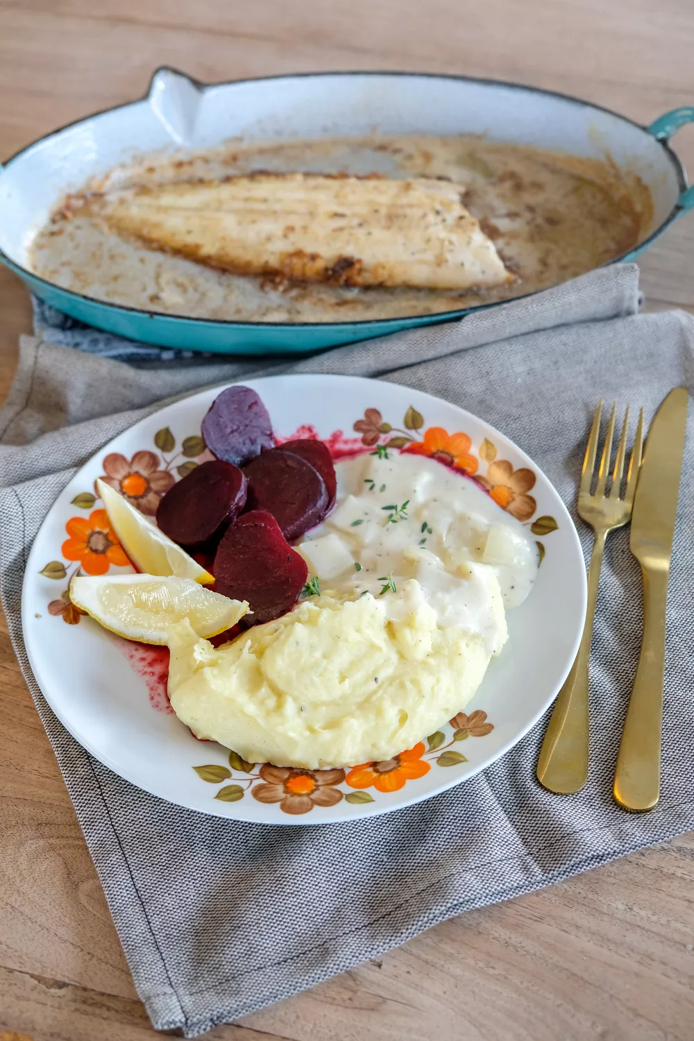 Serveer de zeetongen met de rode bietjes, de puree en de melksaus.