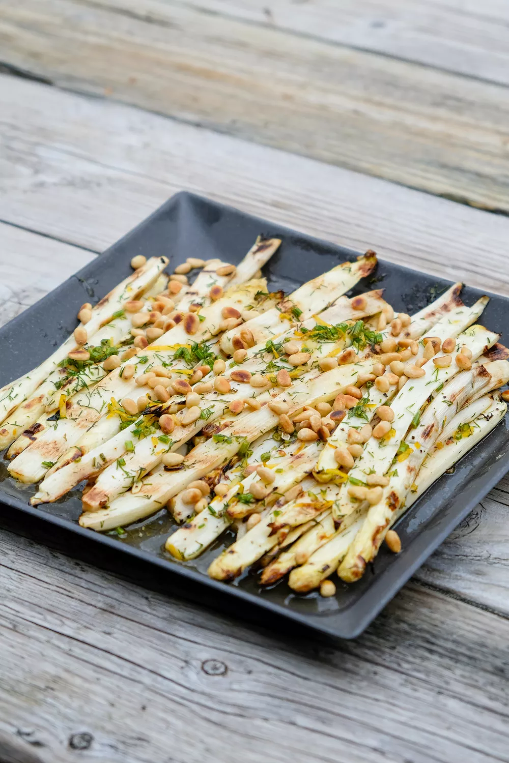 Gegrilde witte asperges met een frisse citroendressing en gehakte dille zijn een licht en smaakvol lente bijgerecht, perfect voor een zomerse barbecue of een snelle, verfijnde lunch. De geroosterde pijnboompitten geven een knapperige tegenhanger bij de zachte asperges. Simpel grillen, afwerken met olijfolie, citroen en zeste levert een mediterrane touch.