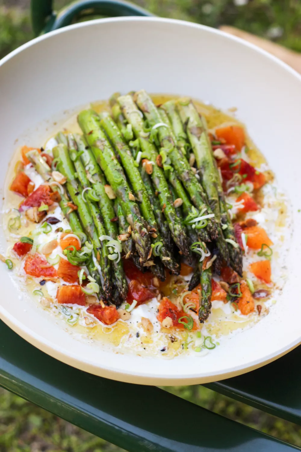 Rokerig gegrilde groene asperges met frisse sinaasappel en romige burrata, een licht feestelijk bijgerecht voor zomeravonden op het terras. De asperges worden kort op de barbecue gegrild en regelmatig overgoten met boter en gegrilde sinaasappelzestes, afgemaakt met fijngehakte amandelen en lente-ui voor textuur en frisheid. Ideaal als elegant voorgerecht of smaakvol bijgerecht bij een zomerse barbecue.