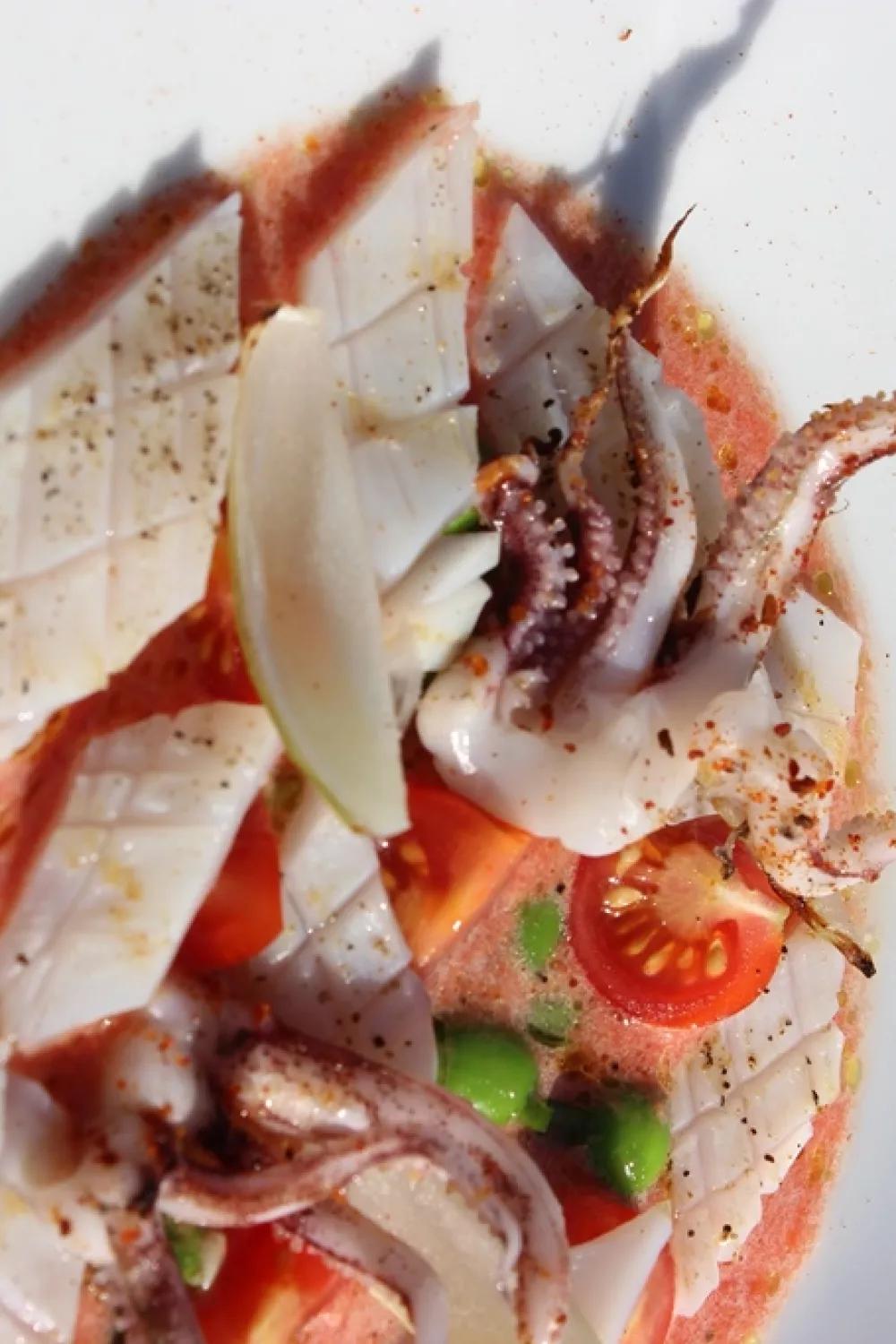 Schep enkele lepeltjes van de coulis van tomaat in een diep bord. Leg er enkele erwtjes en kerstomaatjes bij. Werk af met stukjes inktvis en enkele stukjes gegrilde ui.