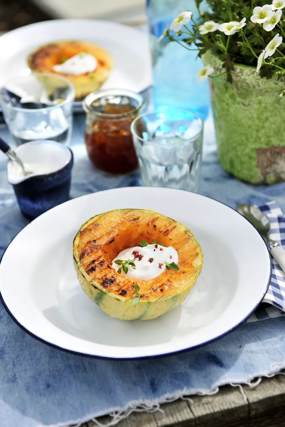 Gegrilde Cavaillon meloen met romige Griekse yoghurt, honing en een pittige toets van geplette rode peperbolletjes is een verrassend licht zomers gerecht. Door de meloen kort op de barbecue te grillen krijgt hij een subtiele rooksmaak die prachtig contrasteert met citroen en olijfolie, afgewerkt met verse oregano. Heerlijk als elegant voorgerecht of fris dessert bij een tuinfeest.