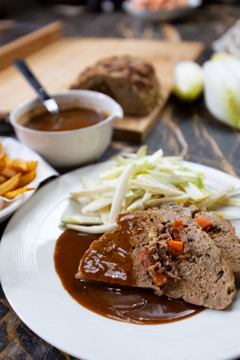 Warm de stoofvleessaus op. Snijd het vleesbrood met een gekarteld broodmes in brede plakken. Serveer porties vlees met witloofsla, verse friet en royaal veel stoofvleessaus.