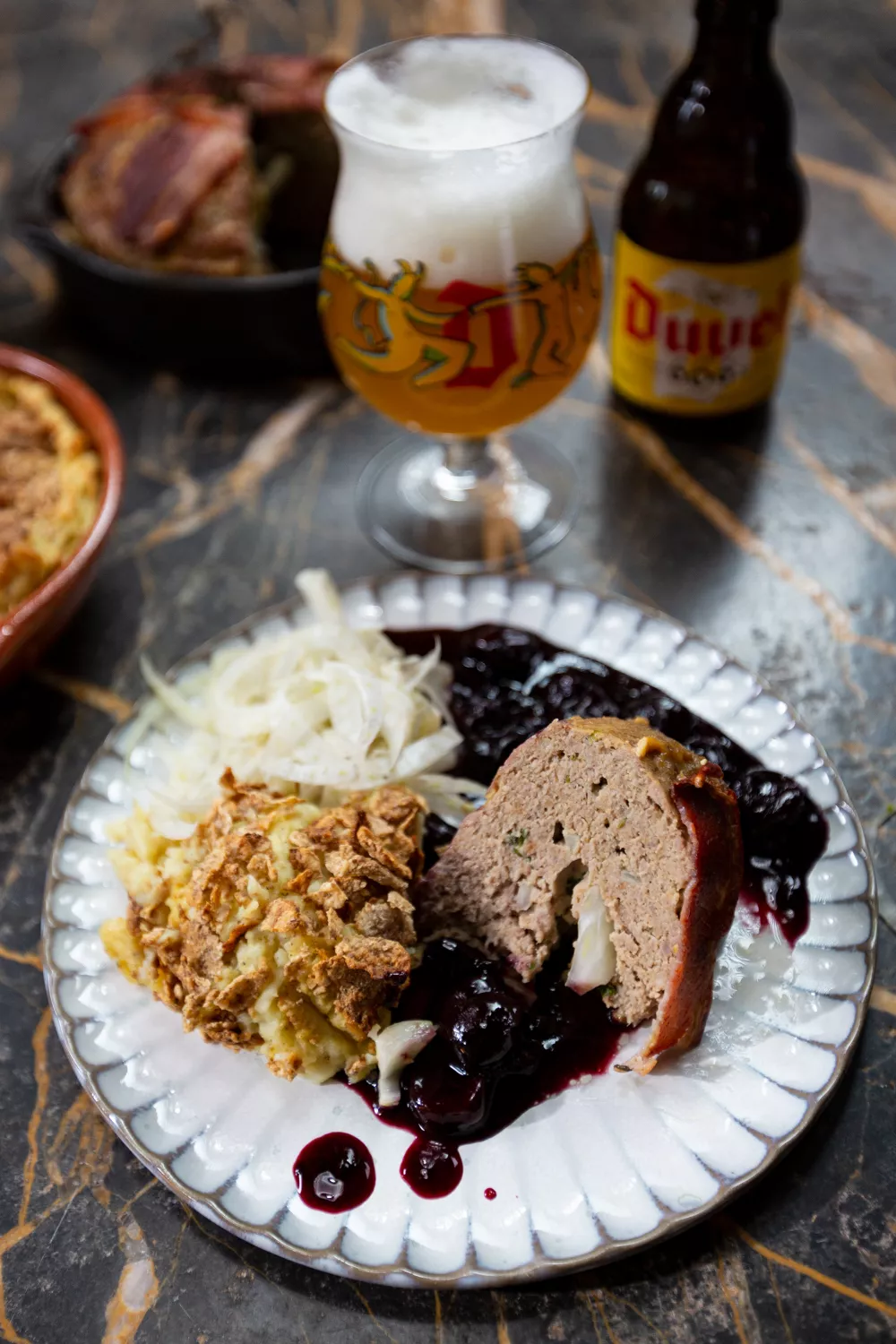 Hartig gehaktbrood gevuld met geroosterde venkel en omhuld door krokant ontbijtspek brengt stevige vleessmaken bij frisse anijsnoten en wordt afgemaakt met een zoete kriekensaus. Het vlees wordt gevuld en langzaam in de oven gebakken, en krijgt gezelschap van romige gegratineerde aardappelpuree en een knapperige venkelsla. Perfect als troostrijke zondagse maaltijd of feestelijk hoofdgerecht in de herfst en winter.