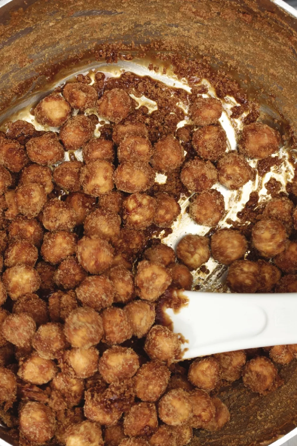 Blijf dan goed roeren zonder de noten te beschadigen. De suikerkorrels rond de noten zullen nu weer smelten tot een karamel en mooi beginnen te blinken. Zorg ervoor dat de karamel niet verbrandt. Hij wordt dan heel donker, zal bitter smaken en is niet meer bruikbaar.