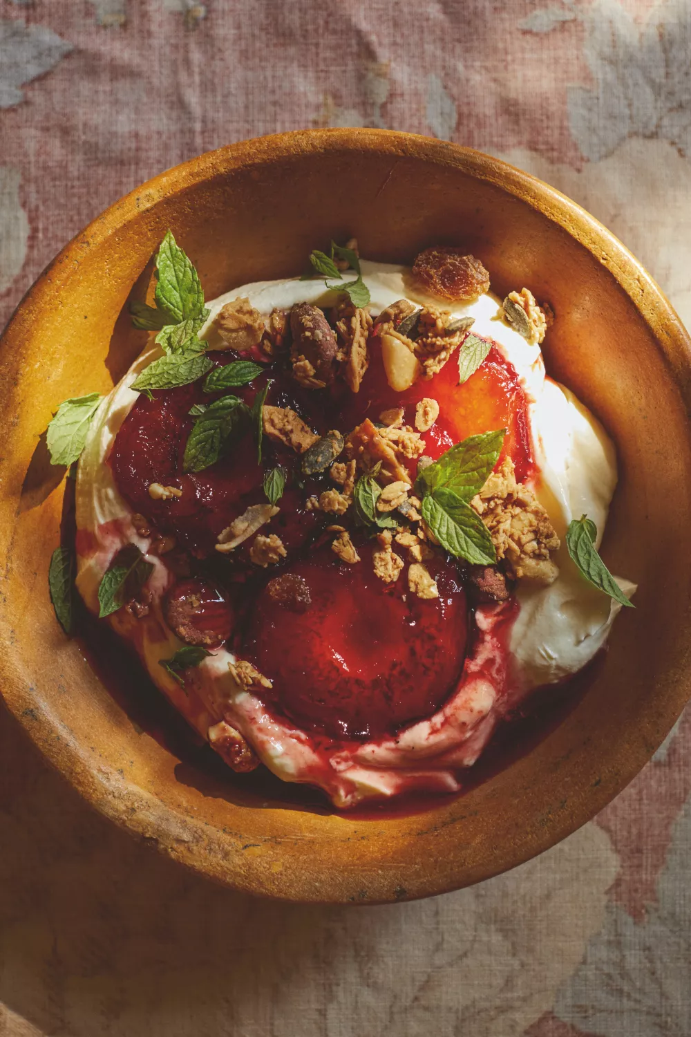 Luchtige geklopte yoghurt met een scheut honing vormt de basis voor dit zachte dessert met warme gestoofde pruimen in madeira en een zalige karamelsaus. Romige room en frisse yoghurt krijgen crunch van granola of geroosterde pistachenoten en verse munt voor frisheid. Snel te bereiden en feestelijk van smaak, perfect voor gezellige avonden in lente en herfst.