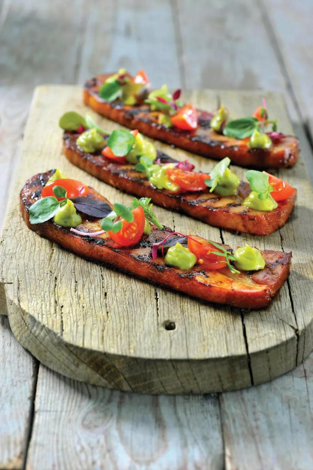Werk het vlees eerst af met toefjes guacamoleen zoetzure kerstomaatjesvoor je de salade erover verdeelt en serveer er een potje BBQ-mayonaisebij.