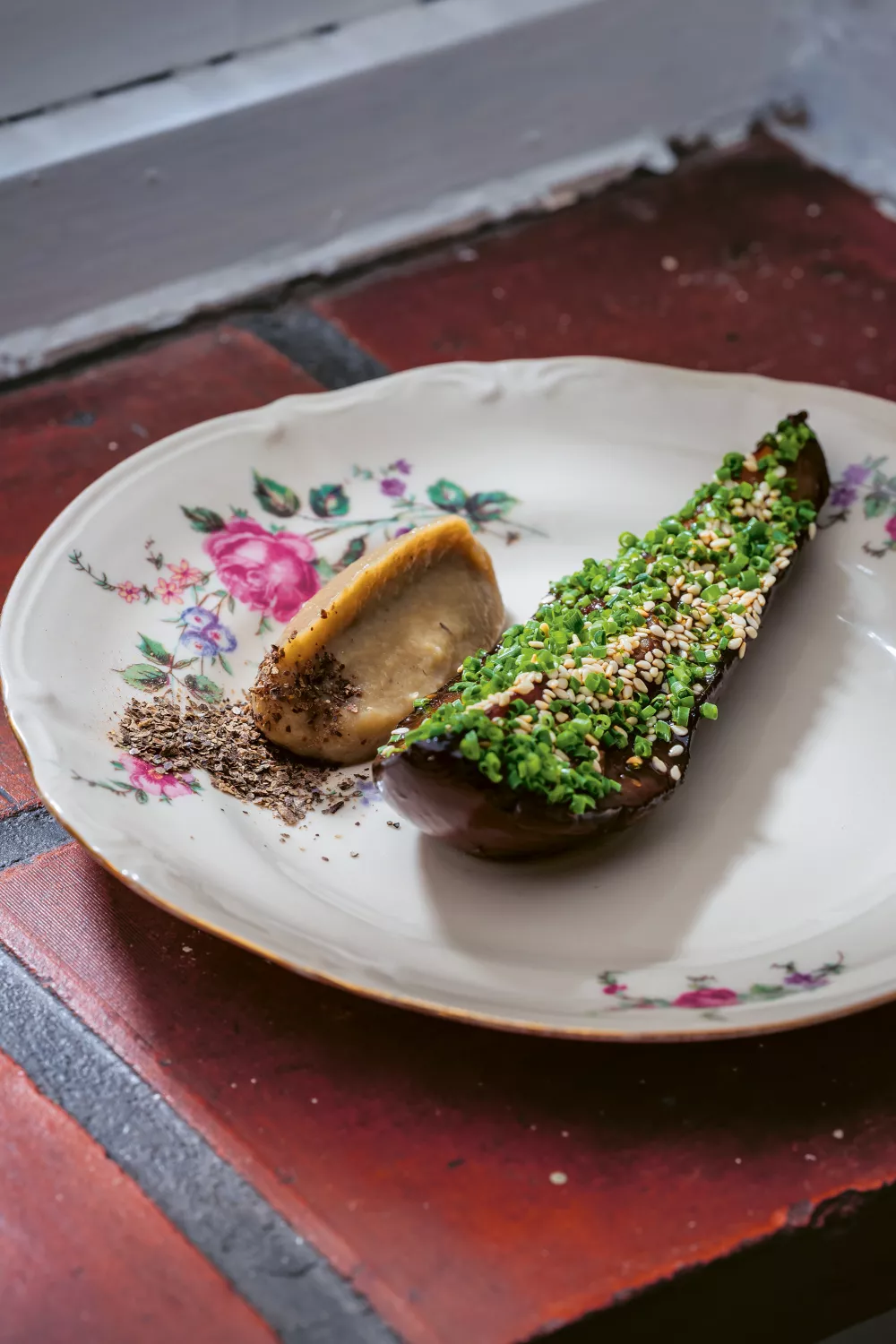Werk de gelakte aubergines af met de fijngesneden bieslook en een zeste van citroen. Dresseer de auberginepuree apart.