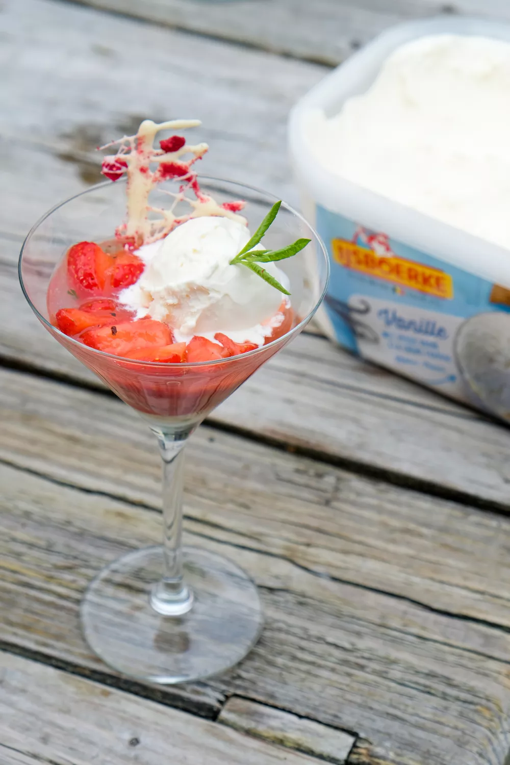 Haal de gelei uit de koelkast en mix glad zodat er geen brokjes meer in zitten. Verdeel over glaasjes, lepel er wat aardbeien over en schep er een bolletje vanille-ijs op. Werk af met de chocoladecreaties en een takje munt.