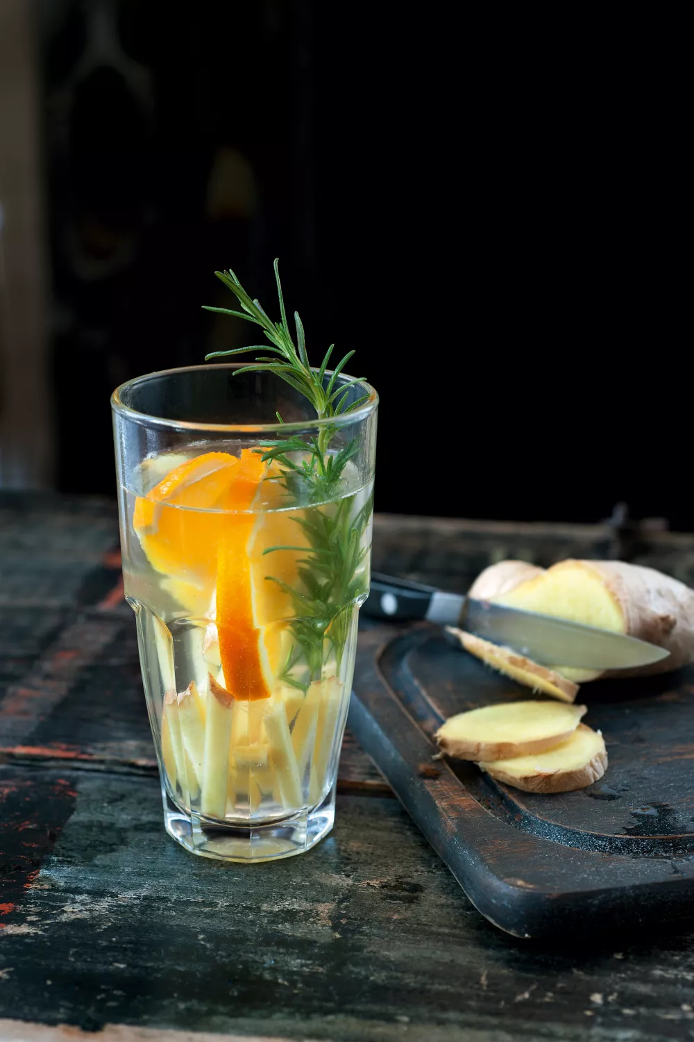 Snijd de gemberknol in dunne reepjes en doe een tiental reepjes in een glas. Vul het glas op met kokend water, het sap van een halve (bloed)sinaasappel en een takje rozemarijn.