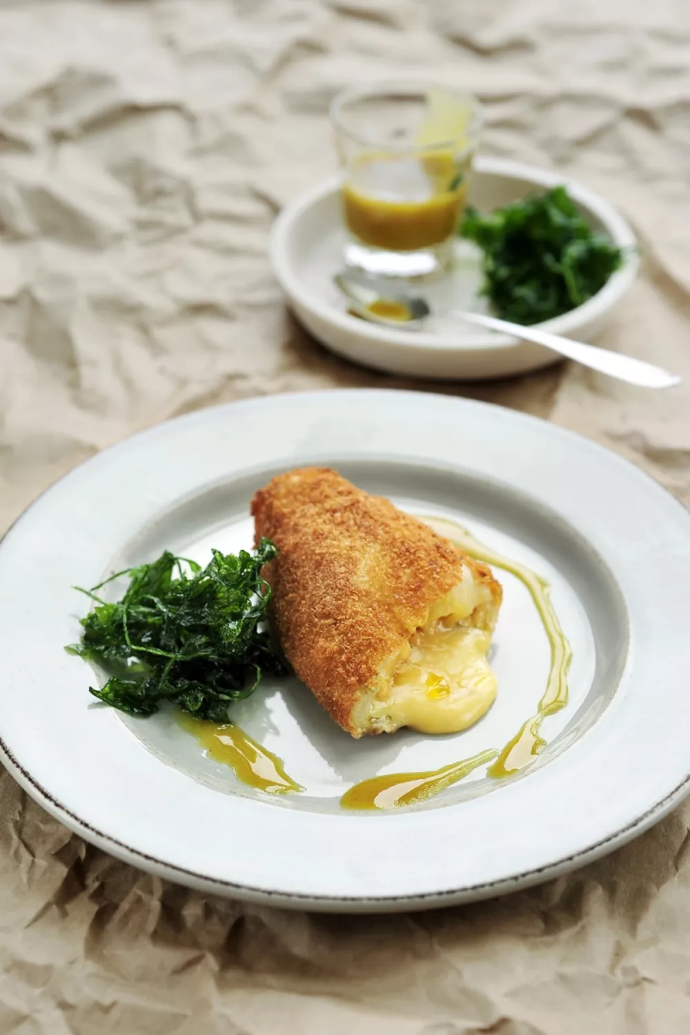 Schik de witloofkroketten op de borden, omring met de honing-mosterd emulsie en werk af met de gefruite peterselie.