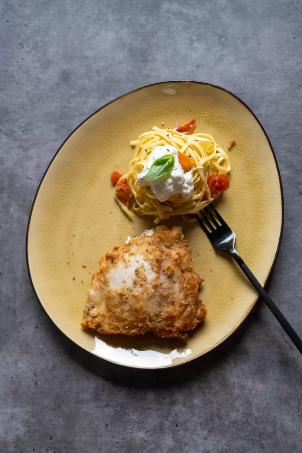 Crispy gepaneerde kippendijen treffen zachte linguine in een Italiaans geïnspireerd gerecht met gehalveerde kerstomaatjes, knoflook en verse basilicum. De kip krijgt een krokant jasje van panko en paneermeel en wordt kort gebakken en in de oven afgewerkt, terwijl de pasta al dente blijft en wordt afgemaakt met Parmezaanse kaas en een lepeltje stracciatella voor extra romigheid. Ideaal als zomerse doordeweekse maaltijd of gezellige avondmaaltijd met vrienden.