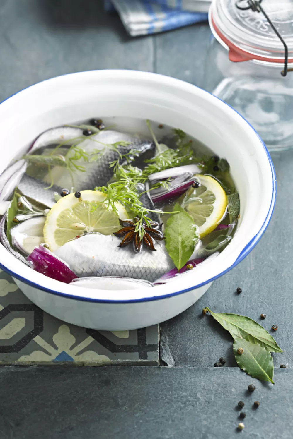Maak de vis schoon en fileer. Of vraag aan de visboer om de haring te fileren. Bestrooi een grote platte schaal met zeezout en schik de visfilet erop. Bedek met zeezout en laat 10 uur staan.