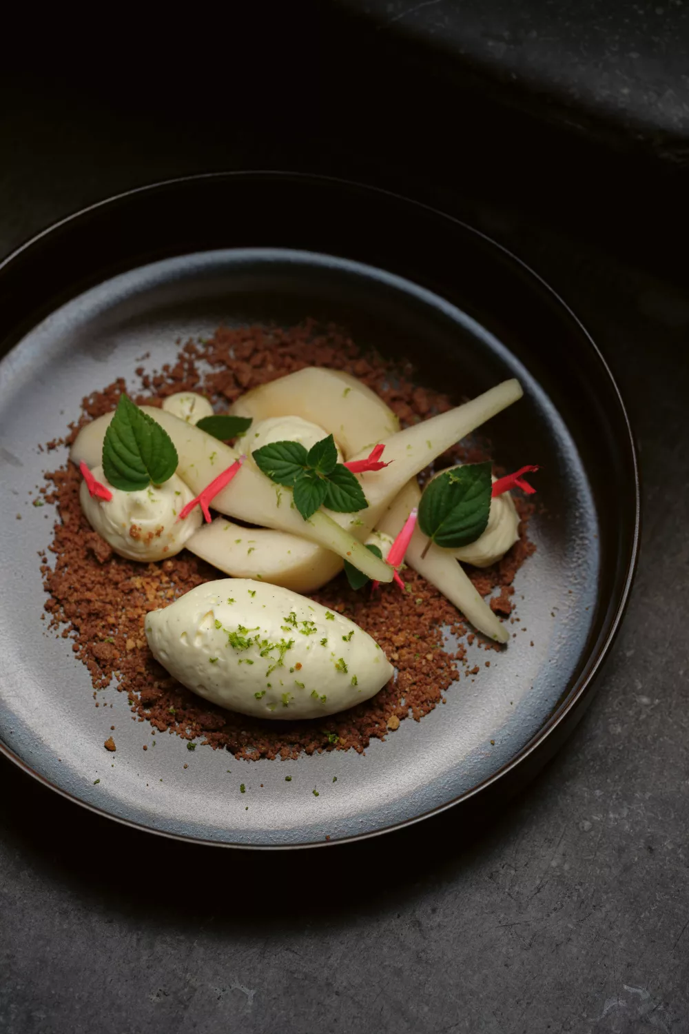 Gepocheerde peer met ananassalie en witte chocolademousse