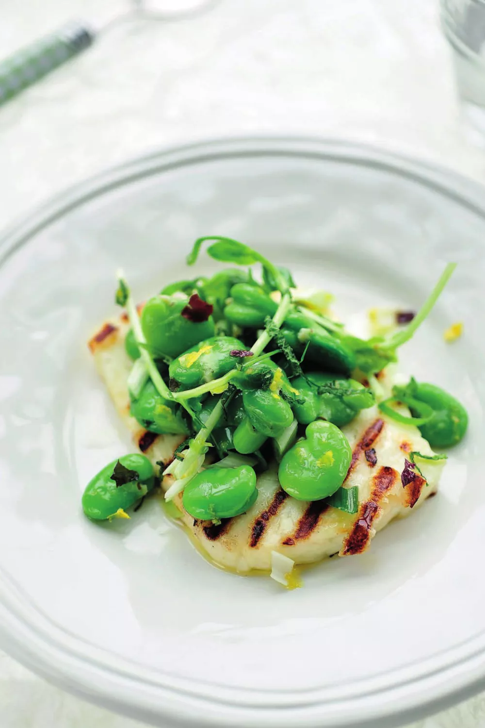 Gergrilde halloumi met salade van tuinbonen, met algen en citroenvinaigrette