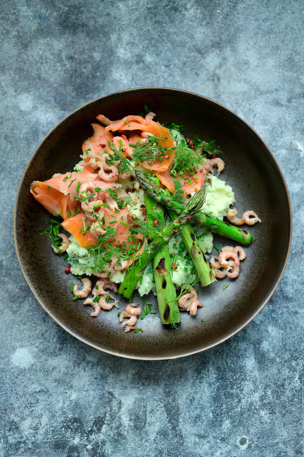 Een lichte, feestelijke lente of zomerschotel van gerookte zalm en garnalen op een romige, gestampte karnemelkpuree met verse dille, peterselie en bieslook. Gegrilde groene asperges geven een rokerige crunch terwijl de puree met boter en ei heerlijk zacht blijft. Perfect voor barbecue, brunch of een elegant visgerecht met roze peperbolletjes als afwerking.