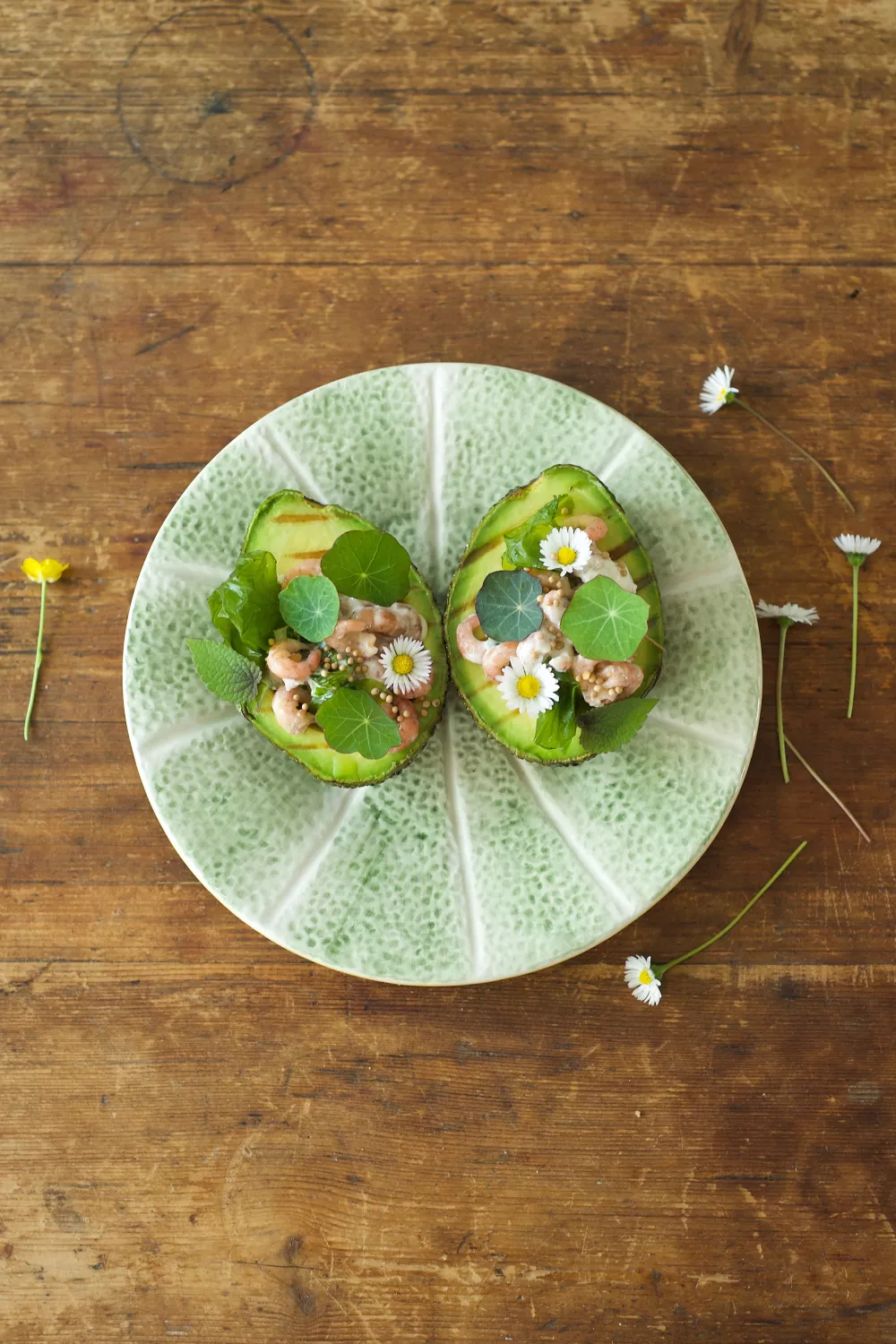 Bestrijk de snijvlakken licht met olijfolie. Bak de vier helften in de pan tot er duidelijke grillstrepen zichtbaar zijn. Vul de avocado's met de zeesla en de garnaaltjes. Strooi er wat mosterdzaad overheen en decoreer met eetbare bloemen, verse kruiden of cress.