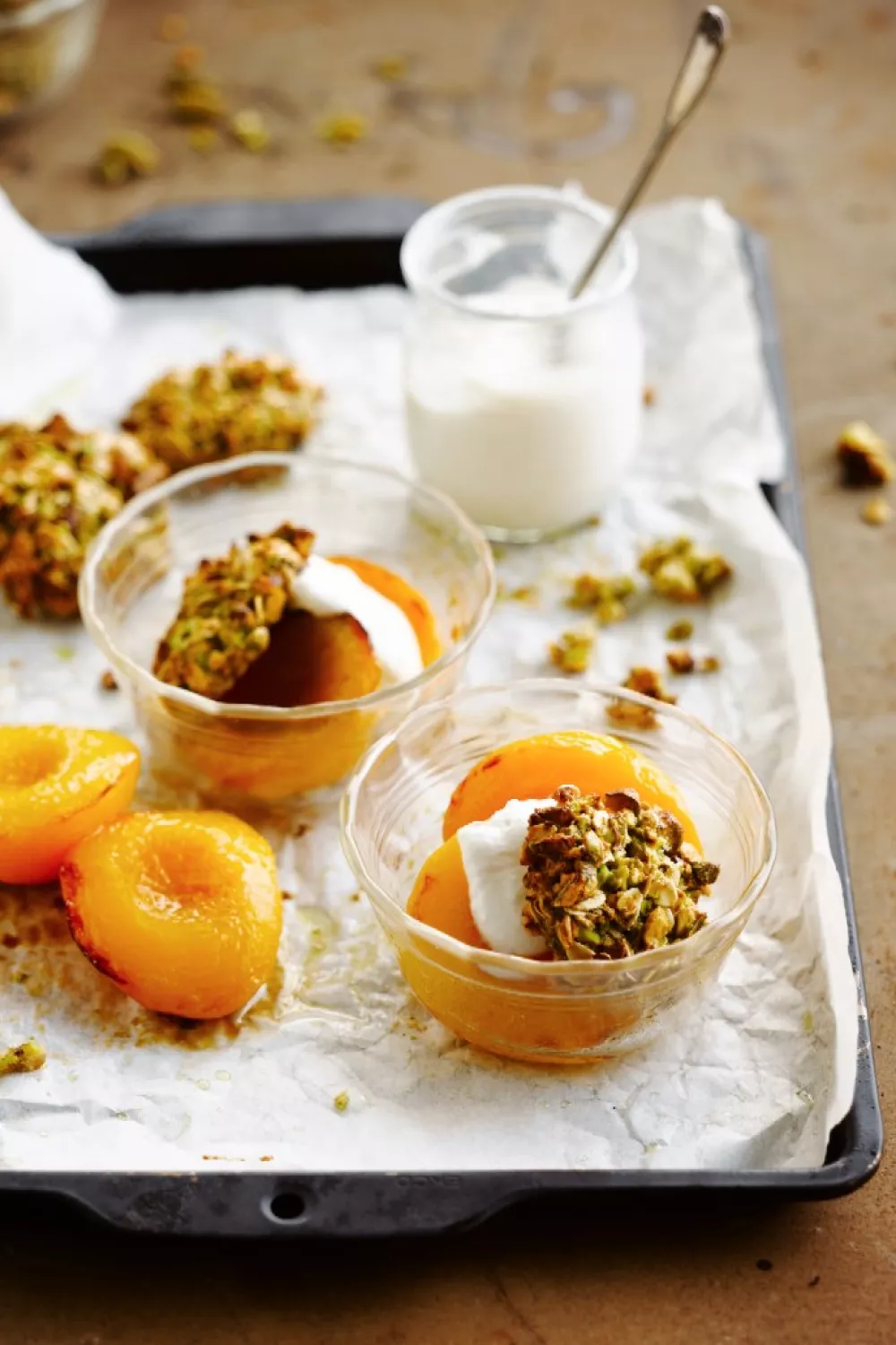Geroosterde perziken met lavendelhoning en een vleugje rozenwater zijn een zomers, elegant dessert dat snel in de oven klaar is. Knapperige pistachenoten en haver vormen er krokante notenkoekjes bij, met kardemom voor een warme, aromatische toets. Serveer met een lepel yoghurt voor frisheid, ideaal bij brunch of als feestelijk nagerecht.