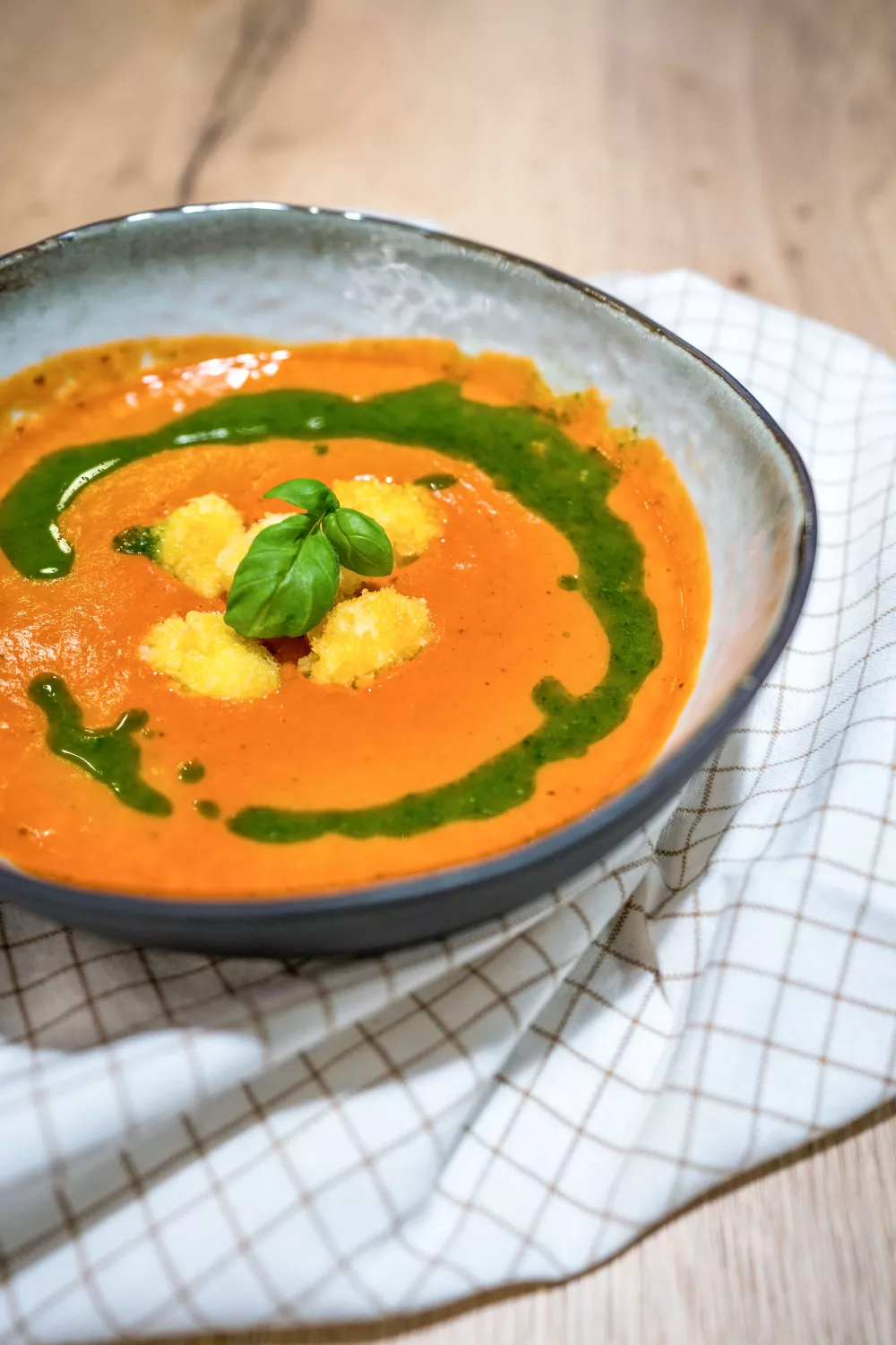 Serveer de warme tomatensoep met in het midden de mozzarella croutons. Besprenkel met de basilicumolie en werk af met een blaadje basilicum.