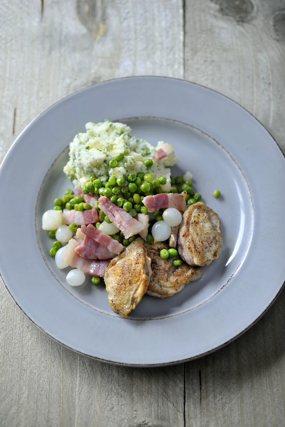 Schik de kwartels, de stoemp en de erwtjes mooi op een bord. Serveer onmiddellijk.