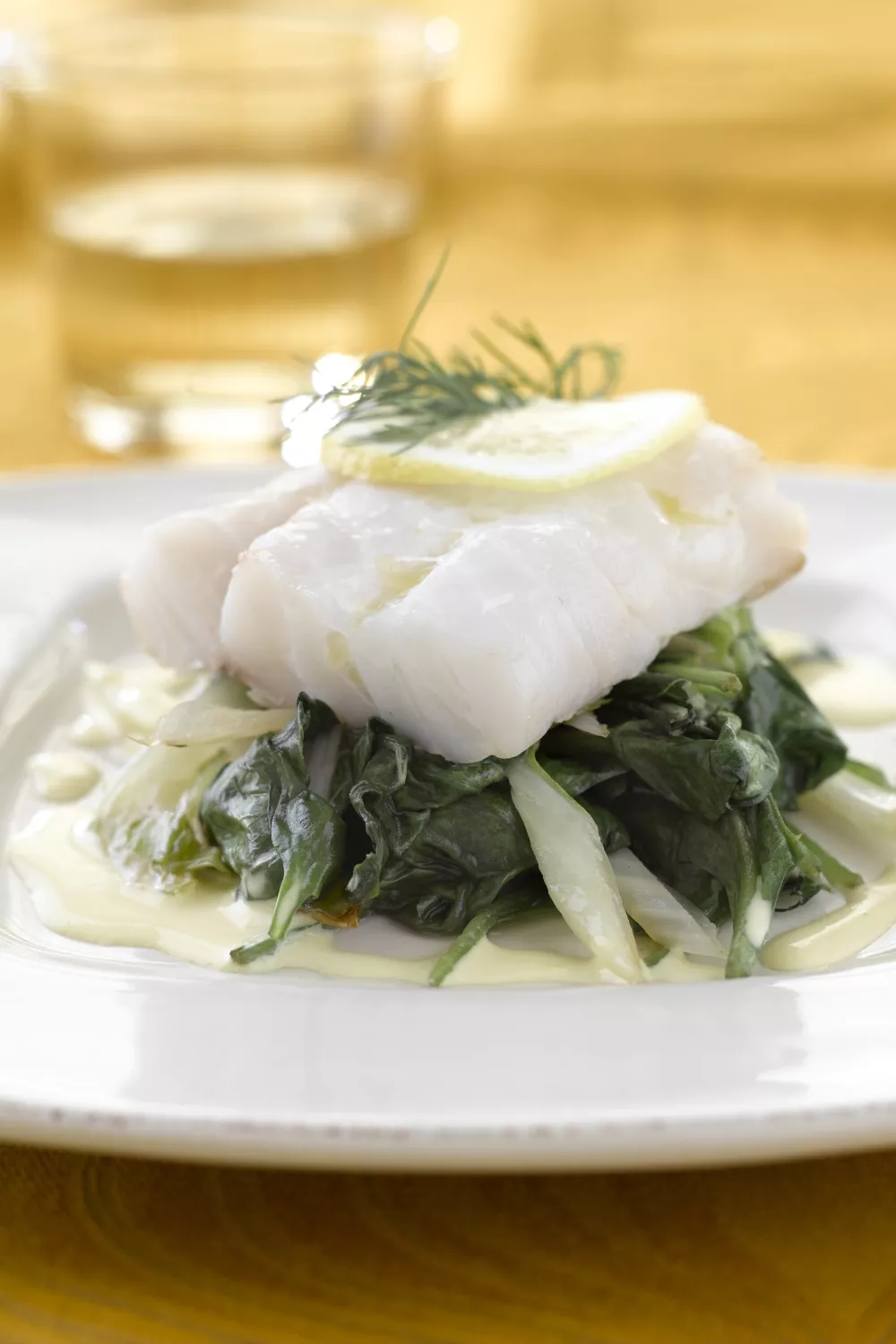 Zachte gestoomde kabeljauw met frisse citroensaus en een bedje van jonge spinazie en paksoi biedt een lichte, elegante smaaksensatie voor lente en zomer. Het stomen houdt de vis sappig terwijl room en losgeklopte eierdooiers de saus zijdezacht maken, met citroen en dille voor frisheid. Perfect als snelle maar feestelijke visschotel naast gestoomde aardappelen.