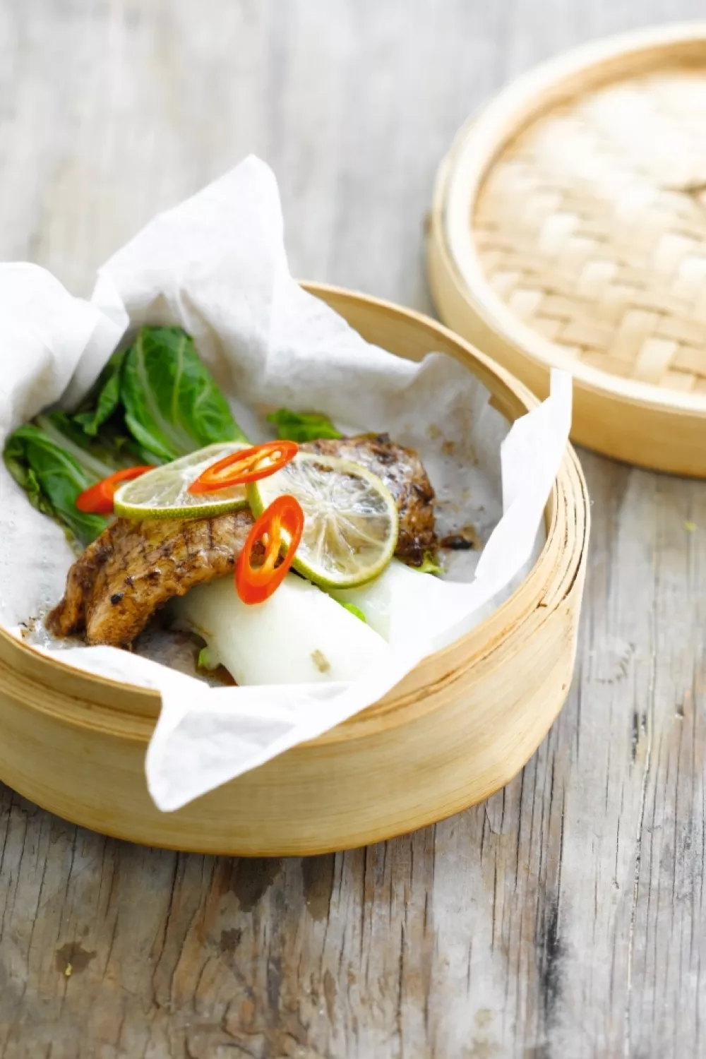 Leg de fijngesneden paksoi op een bakpapier en daarop één visfilet en bestrooi met fijngesneden chilipeper en limoenschijfjes.