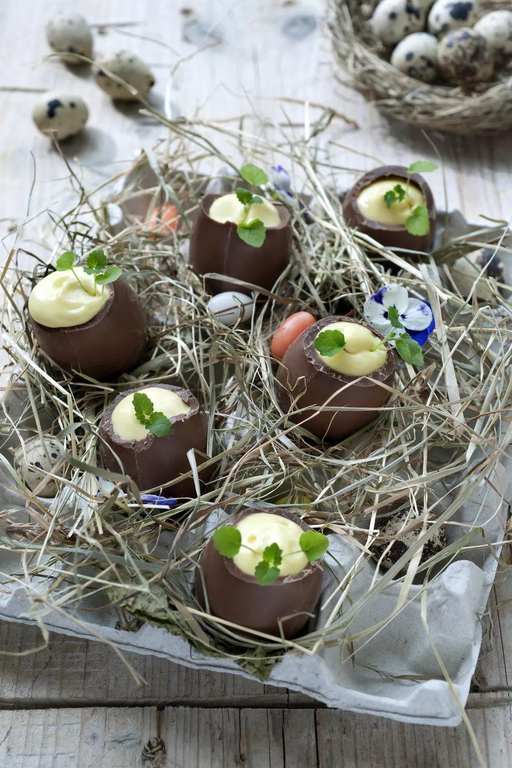 Zachte romige vulling van vanille, jenever en eierdooiers vult kleine chocolade paaseitjes tot een feestelijk paasdessert. De custard wordt zacht gegaard en afgekoeld, daarna luchtig gemaakt met room en in een espumabus geladen. Ideaal als elegant hapje bij de paasbrunch of als verrassend borreldessert in de lente.