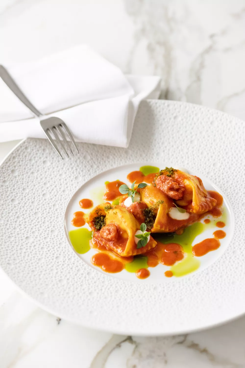 Klop de eierdooier los in een kommetje. Leg een vel pasta op het werkblad en spuit in het midden van het vel kleine toefjes vulling op regelmatige afstand van elkaar. Bestrijk de lange randen met wat eierdooier. Vouw de onderste helft over de bovenste helft en druk aan. Snijd het overtollige deeg met een pastaroller weg.
