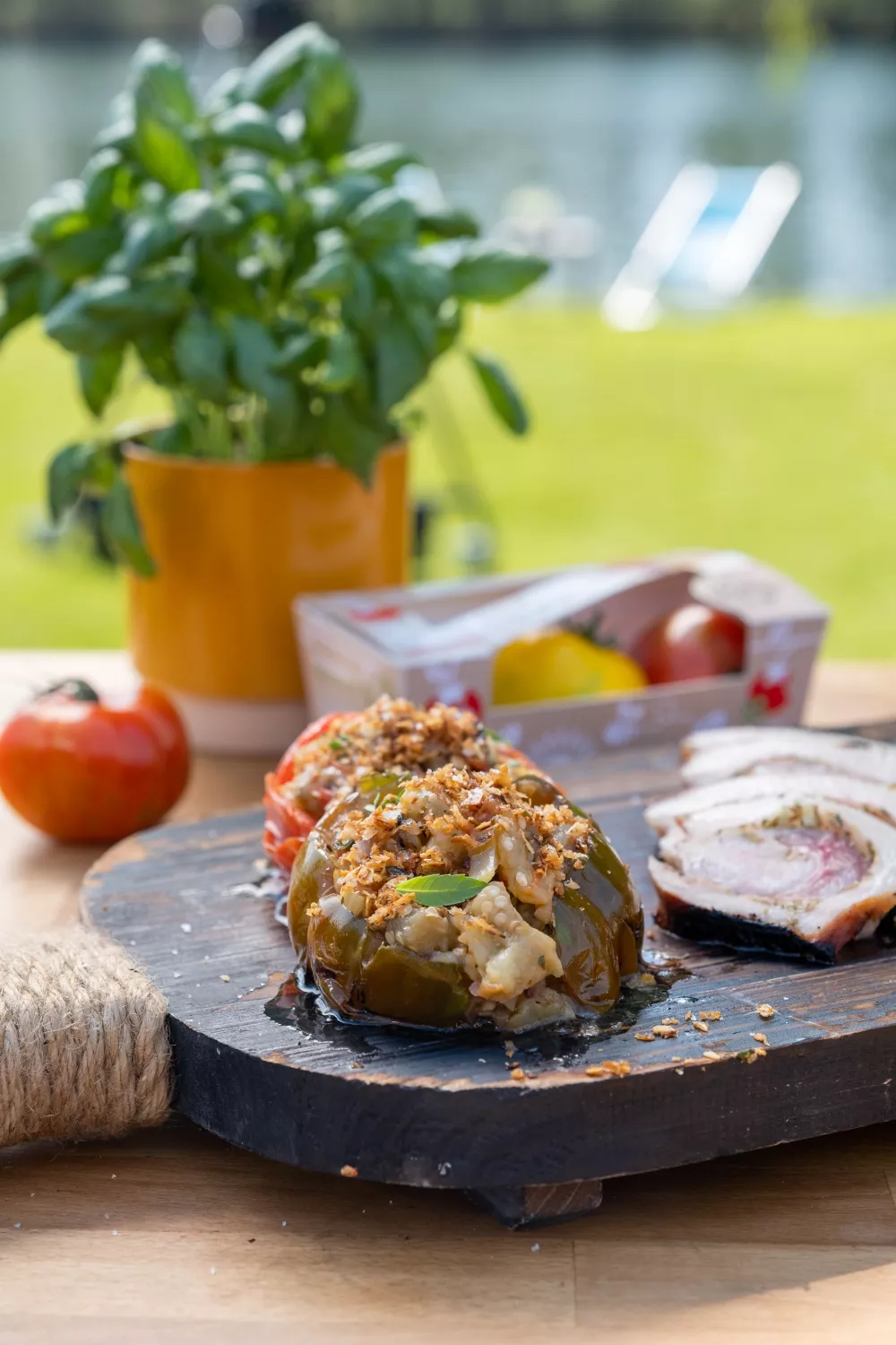 Hol de vleestomaten uit. Doe het vruchtvlees van de tomaten nog bij de caponata. Haal de aubergine van de grill, lepel er het vruchtvlees uit en voeg ook nog toe. Laat het geheel nog een minuutje sudderen en breng de caponata nog verder op smaak met enkele blaadjes verveine, citroentijm, een scheutje olijfolie en een lepeltje kappertjes. Vul vervolgens de uitgeholde tomaten op met de caponata en plaats ze nog enkele minuten op de grill.