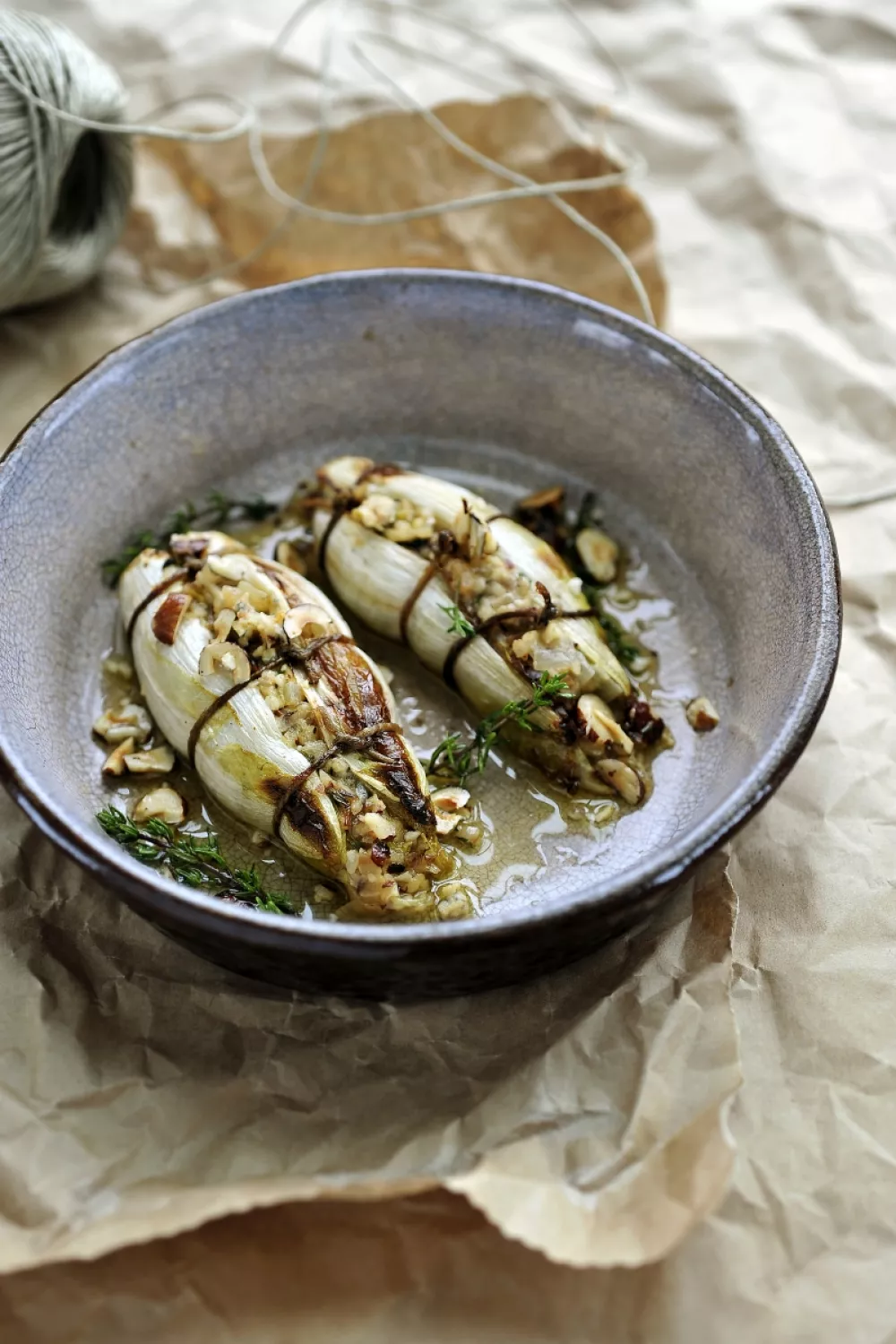Gevulde witloofstronken met stilton, dadels en hazelnoten