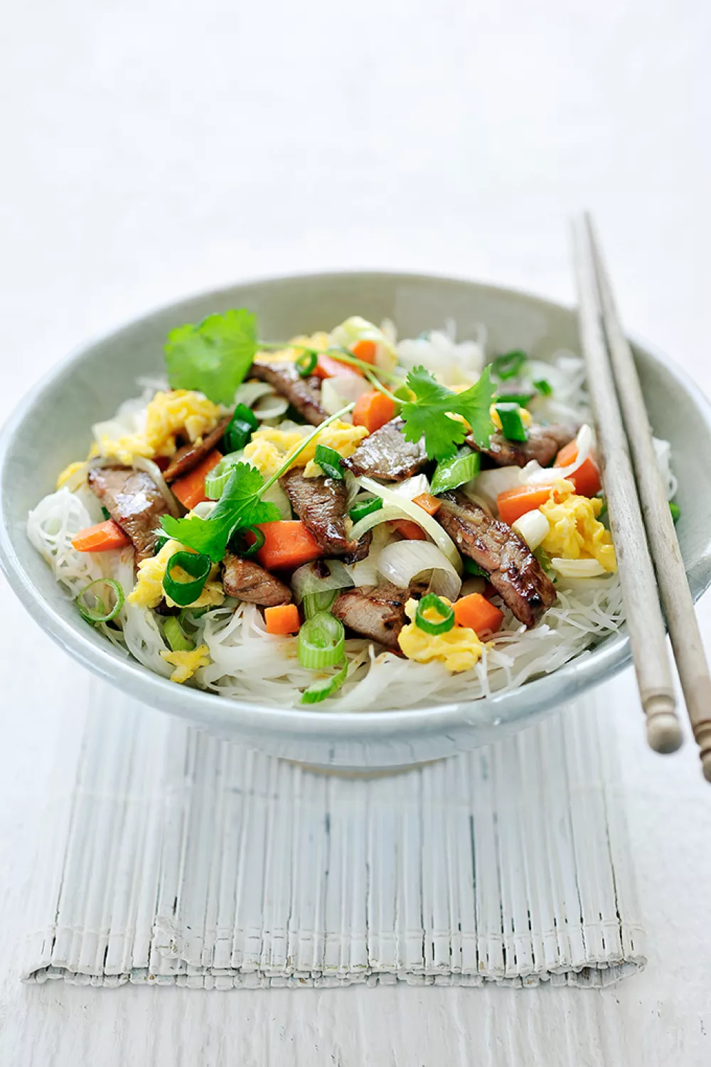 Kook de mie volgens de instructies op de verpakking. Klop de eieren los in een kommetje en kruid met peper en zout. Verwarm een wokpan en giet er de losgeklopte eieren in, roer tot je vlokken krijgt. Houd apart om later als topping te gebruiken. Giet de mie af. Snijd het rundvlees in plakjes en wok samen met de fijngesneden groentjes. Voeg de mie toe en, op het laatst, de koriander. Serveer met de eiervlokjes.