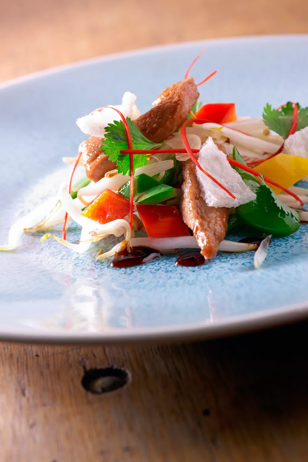 Crispe gewokte spieringreepjes met gember, knoflook en pittige chili, gecombineerd met sugar snaps, paprika en sojascheuten voor een kleurrijke Aziatische roerbak boordevol textuur en umami. Afgewerkt met sojasaus, verse koriander en krokante kroepoek geeft dit visgerecht een frisse, hartige smaak. Ideaal als snelle doordeweekse maaltijd of lichte zomerse avondschotel dankzij de snelle woktechniek.